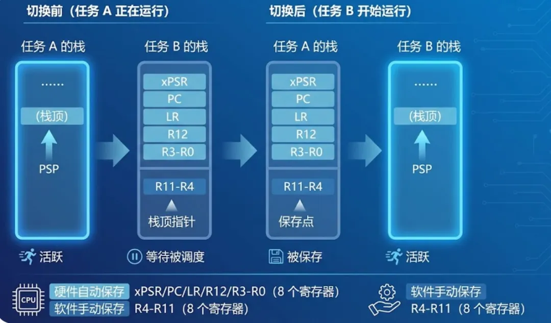 这里有个细节要注意:ARM Cortex-M 在进入中断时,硬件会自动保存一部分寄存器(R0-R3、R12、LR、PC、xPSR),这部分不用软件操心。软件需要手动保存的是 R4-R11 这几个寄存器。