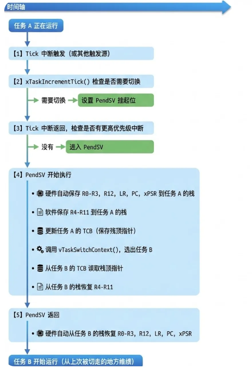 一句话总结:Tick 负责”决定要不要切”,PendSV 负责”真正去切”。