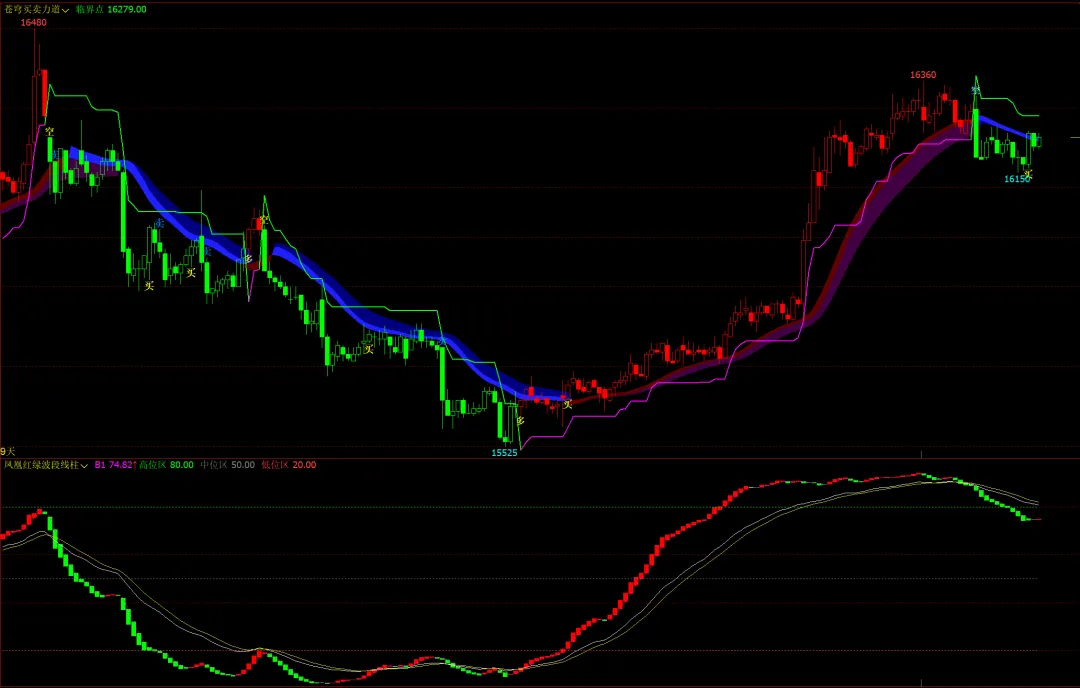 凤凰红绿波段柱幅图:红绿多空柱,双趋势线