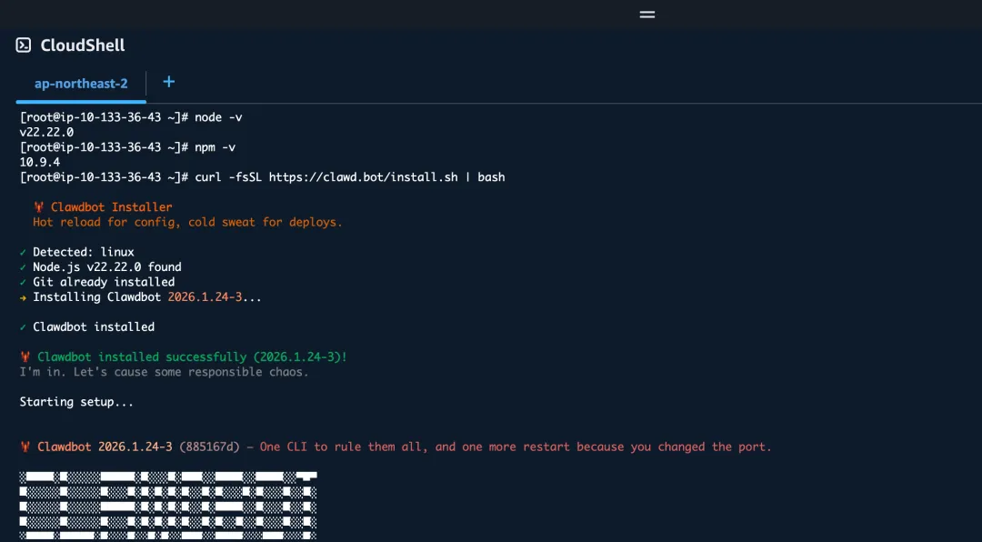(图:Clawdbot 的命令行启动界面,不仅能看日志,还能直接在这里和 AI 对话)