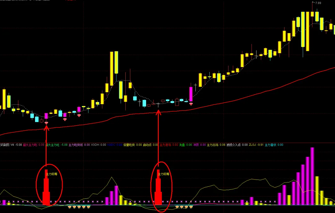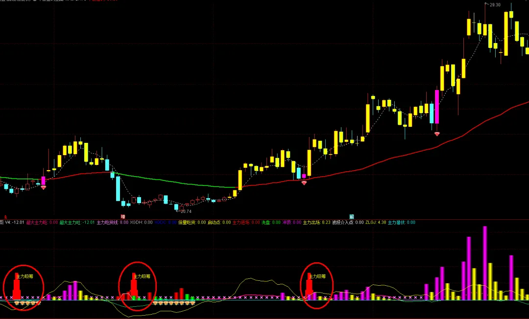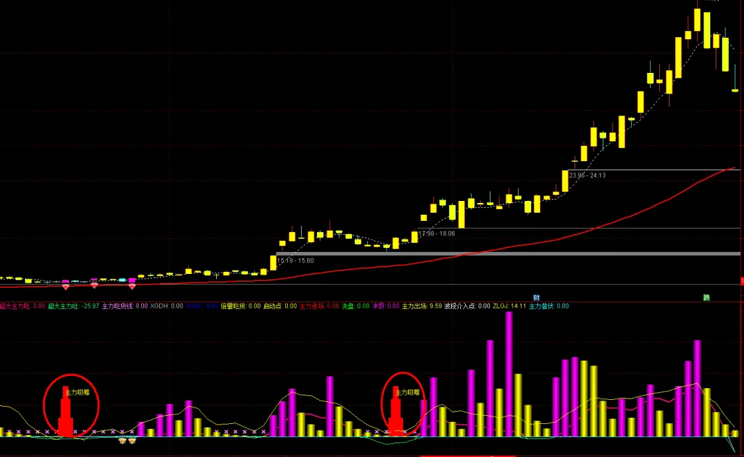 指标主要通过多维度数据综合判断主力资金的动向与市场情绪,识别潜在的强势股启动时机。其核心逻辑包括:监测价格突破关键高点、主力资金持续吸筹、以及短期超跌后的反弹信号。当价格有效突破前期压力位且伴随主力资金明显流入时,系统会发出“牛股启动”或“倍量吃货”信号;同时结合趋势强度和筹码分布,标记出主力吸筹、洗盘、冲顶及出场等不同阶段,辅助投资者把握波段操作机会。