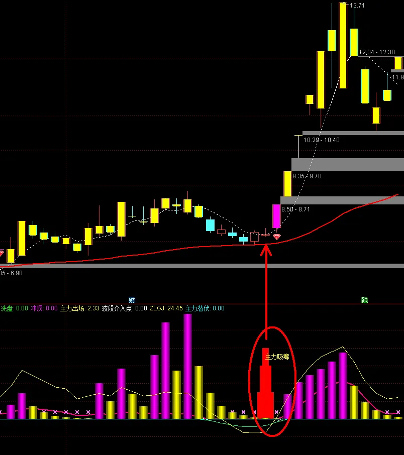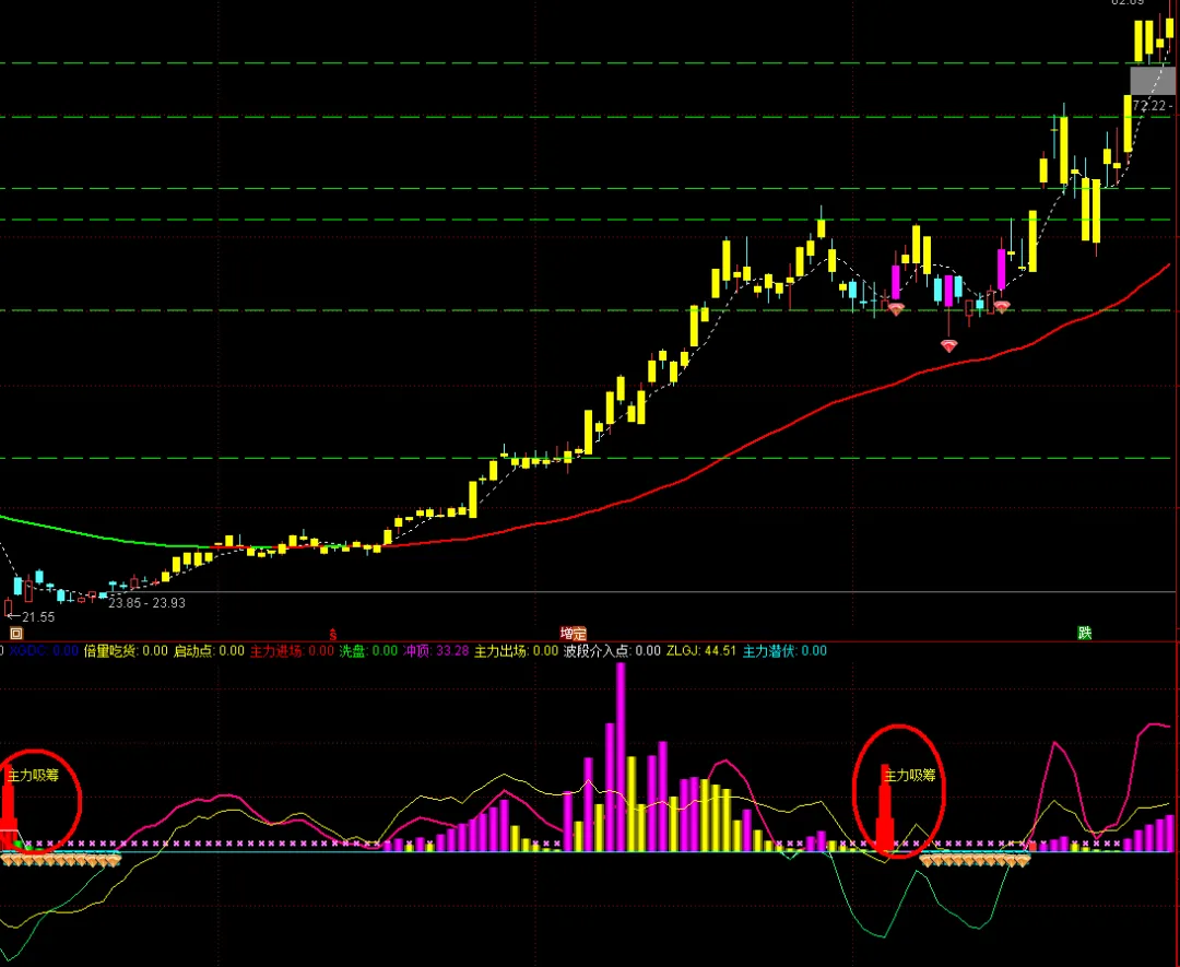 DRAWTEXT(启动点,70,’主力吸筹’),COLORYELLOW;