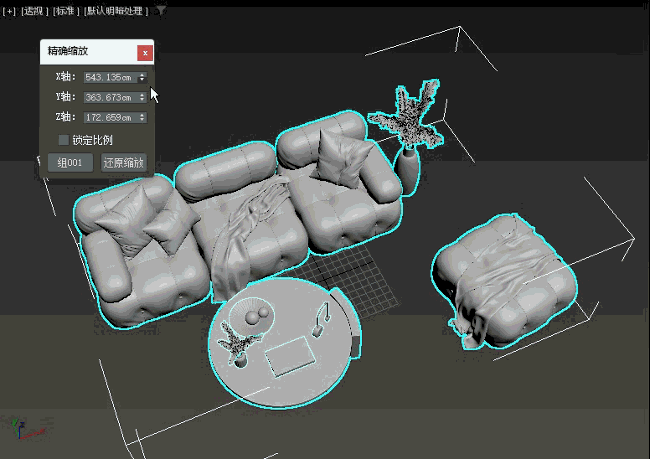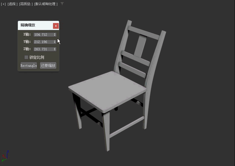 2.分别调节X轴、Y轴或Z轴参数大小,实时查看缩放对象大小。勾选“锁定比例”,X轴、Y轴和Z轴按等比例缩放。如图: