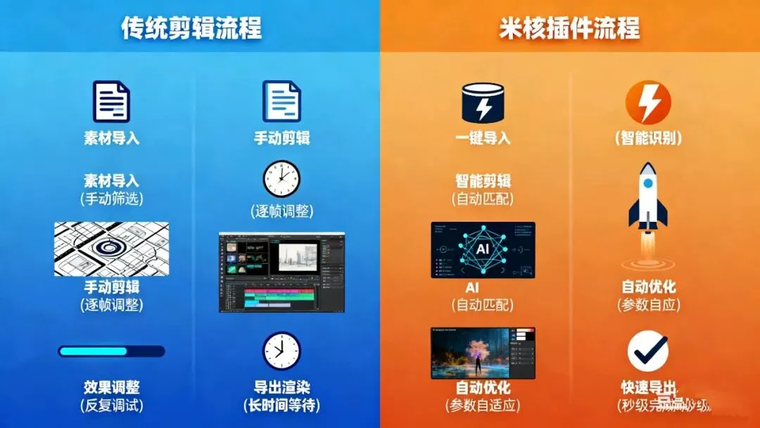 传统剪辑VS米核插件 核心对比,差距一眼看穿