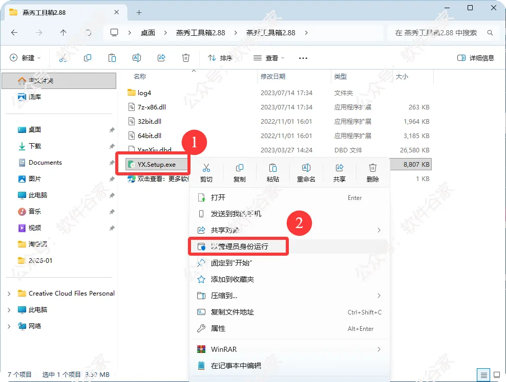 关闭AutoCAD→右键“YanXiuSetup.exe”以管理员身份运行。