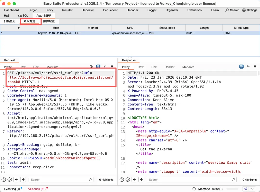 该插件会进行被动扫描ssrf漏洞,一旦匹配到类似于url请求到参数,就会自动替换成burp自带的dnslog进行测试。