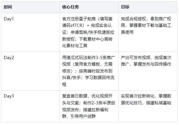 总结:星子助推APP拉新运营的核心是“合规+简单+坚持”,零门槛、零投入,新手通过“注册授权-复用素材-精准推广-数据优化”的流程,3天即可开赚,稳定运营后个人月入3000-6000元,团队规模化运营月入数万可实现。关键在于选对高转化项目、用对官方素材、聚焦高效渠道,避免踩坑,持续优化,就能抓住拉新红利。