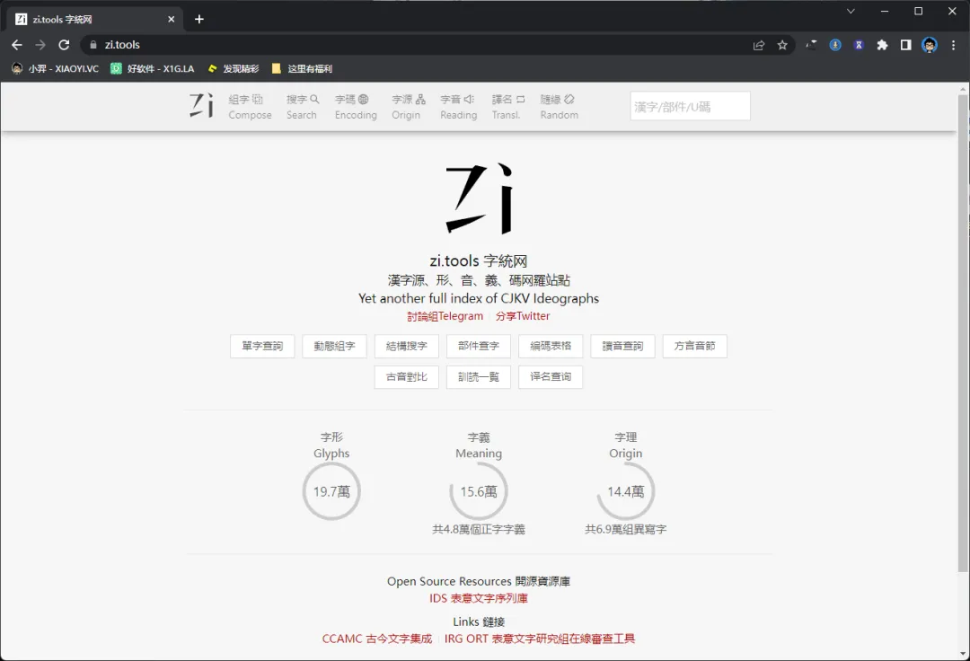 想查询汉字相关诠释可以通过这个「Zi Tools」网站,提供了于汉字的字形演化、字源、字义、字符编码,功能之全,可以组字,搜字,字码,字源,字音还可以随缘找字。
