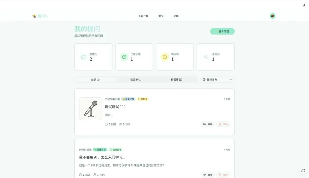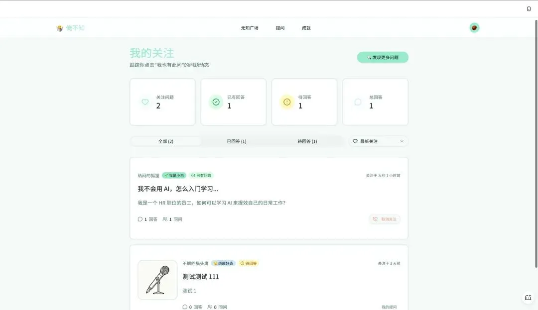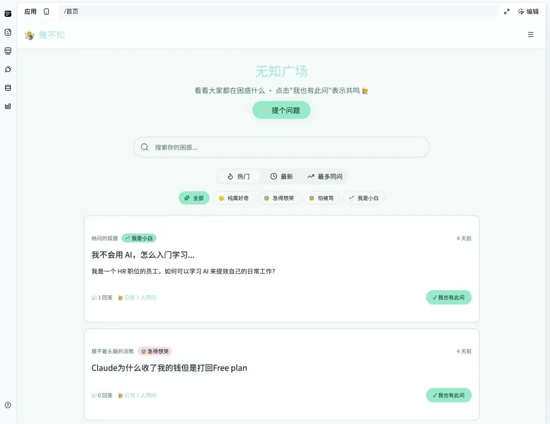 一个漂亮的问题卡片列表,每张卡片显示问题标题、提问者的随机马甲名字、已有多少人同问、问题的情绪标签并且要支持按热度排序等等。