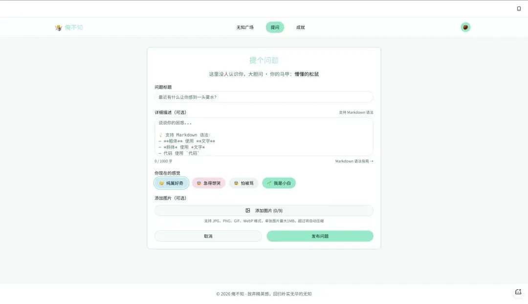 我想要一个表单,包括问题标题输入框、详细描述(支持 Markdown)、一个随机马甲名字自动生成、四个情绪标签让用户选择自己的感受,还有上传图片的功能。