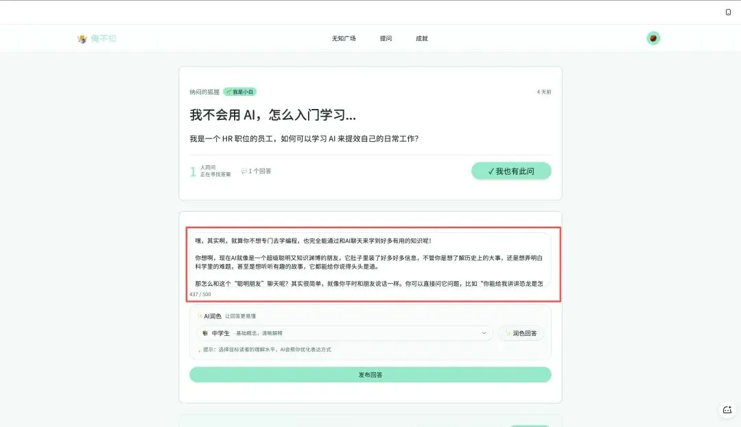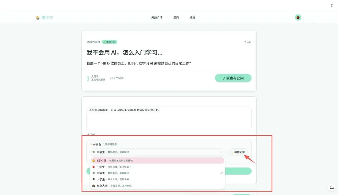 选完了,AI 就会帮你把回答调整成适合那个级别的表达方式,比如上面的初步回答润色给中学生后的效果: