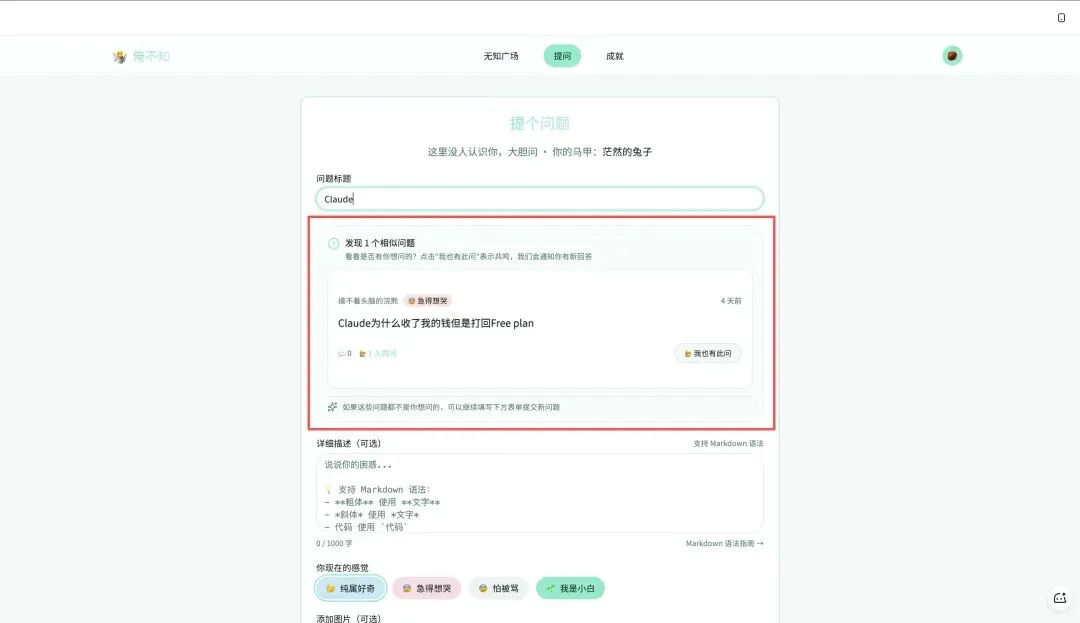对了,这里还有个有趣的地方,就是当用户在填写问题时,系统也会时时刻刻检测你的问题是否跟无知广场的其他问题类似: