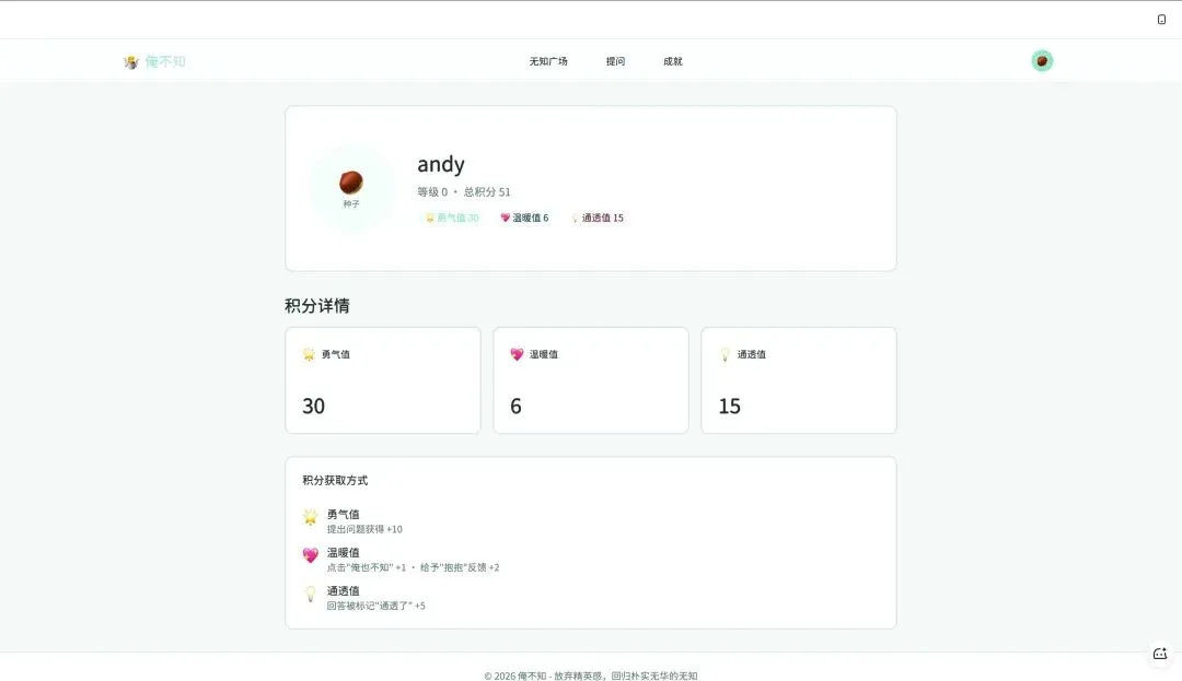 配合这个积分系统,我又设计了成就勋章——勇气值达到 10 就能解锁“坦诚相待”勋章,温暖值达到 100 解锁“最好的听众”,有回答被 20 个人标记为“通透了”就能解锁“降维打击”等等: