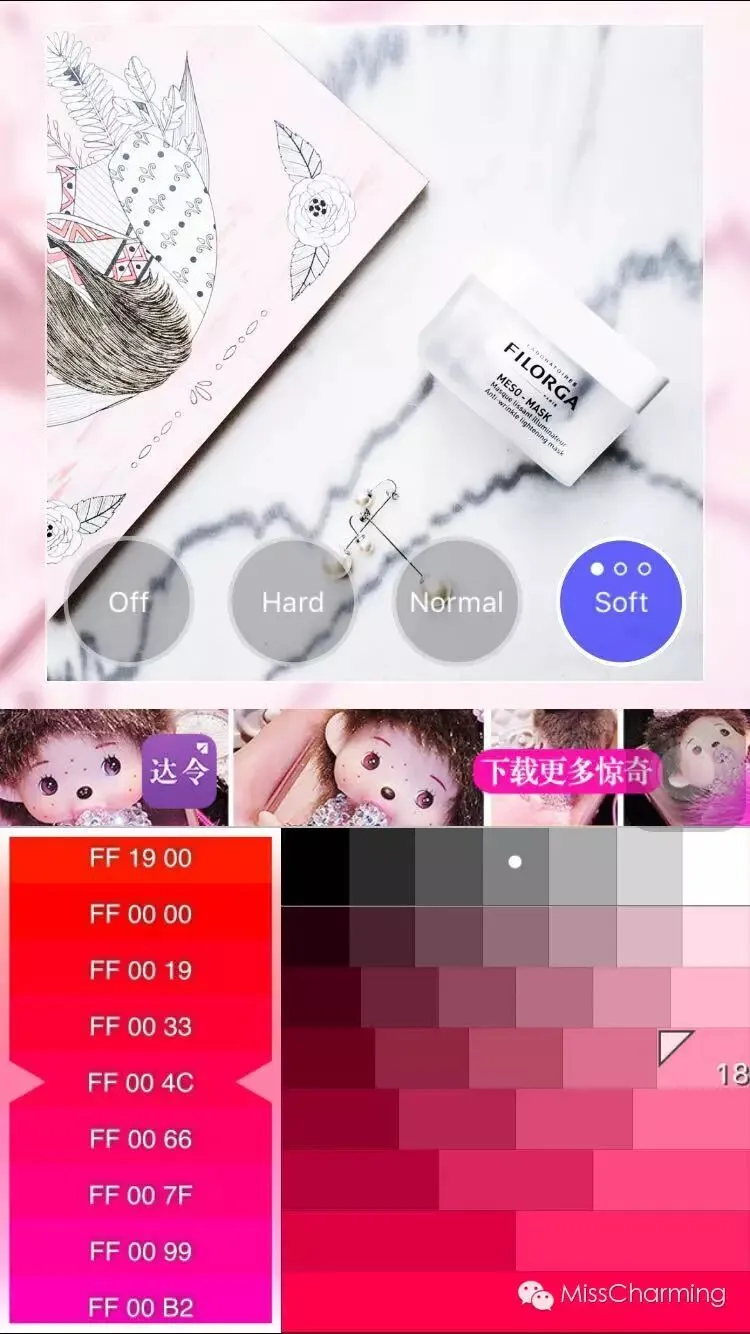 4、点击左下方调色板可增加半透明效果,选择需要的颜色和透明度(Off/Hard/Normal/Soft);(可选)