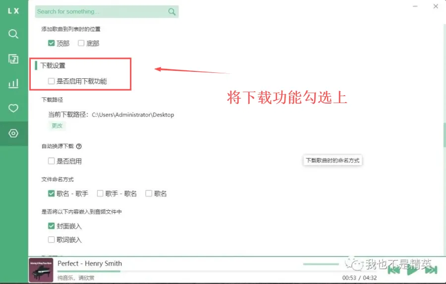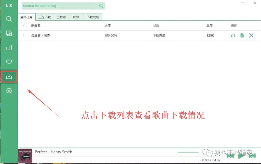 电脑端与手机端其实并无太大的差异,不过在电脑端如果下载歌曲首先需要在设置里面将下载功能打开,在这里可以对下载歌曲的位置以及是否下载歌词等进行设置,然后搜索想要下载的歌曲,最右面点击下载按钮即可下载的歌曲可以在下载歌单中进行查看。