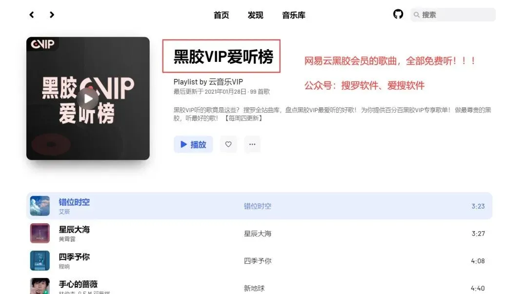 平时在网易云上需要充值黑胶会员,才能听某一些歌曲。现在有了这款软件,网易云黑胶Vip歌曲,直接全部免费听,如下图所示: