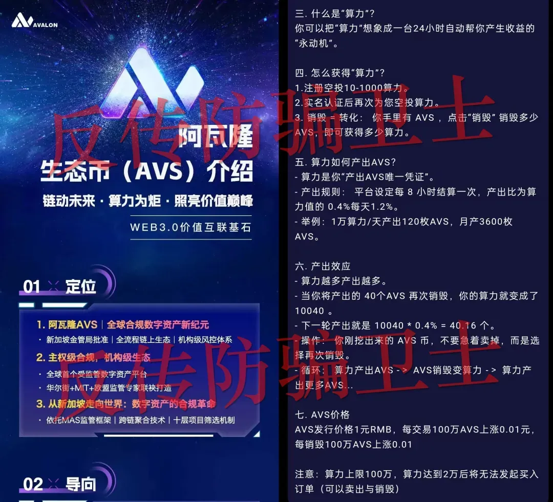 18、阿瓦隆生态(AVALON):先包装成新加坡监管、华尔街团队打造的合规数字资产项目,以 “零撸挖矿” 为噱头吸引注册;随后设陷阱,宣称 “零撸” 却限制不充钱无法卖出,强制用户投入资金;接着鼓吹月化 36% 的高静态收益,实际投入后需 3 个月才回本;其模式依赖销毁 AVS 提升算力、拉人头拿十级佣金,本质是靠后入资金兑付前期收益,一旦新用户不足就会跑路,导致参与者投入的资金血本无归。