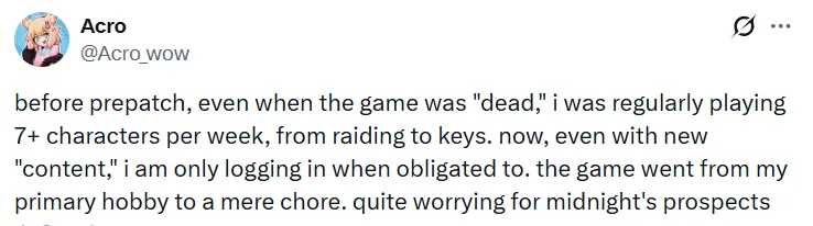 在前夕更新前,即便游戏已陷入死寂,我每周仍坚持操作7个以上角色,从团队副本到大秘境从不缺席。如今即便推出新内容,我也仅在不得不登录时才上线。这款游戏已从我的主要爱好沦为纯粹的例行公事。这实在令人担忧至暗之夜前景。