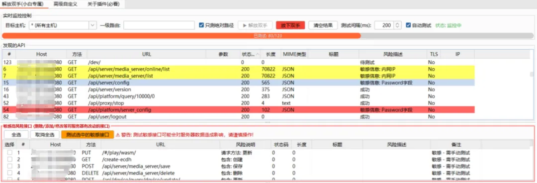 敏感接口会被单独列出,需要手动确认后才能测试,避免误操作