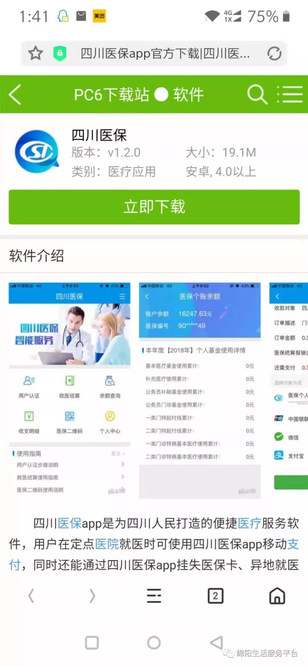 点击页面最下面“阅读原文”进入下载页面,根据提示在浏览器里打开,点击“立即下载”即可下载,文件名:com.yinhai.scsyb_10109.apk