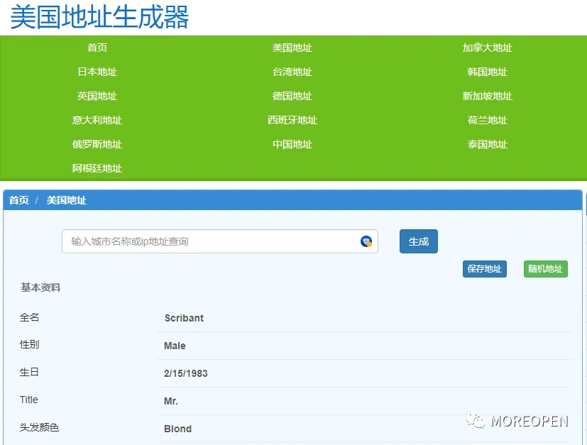 以下生成网站可提供人名,地址,电话,出生年月,星座,邮箱(真实邮箱),信用卡,职业,身高体重等其它一些信息。