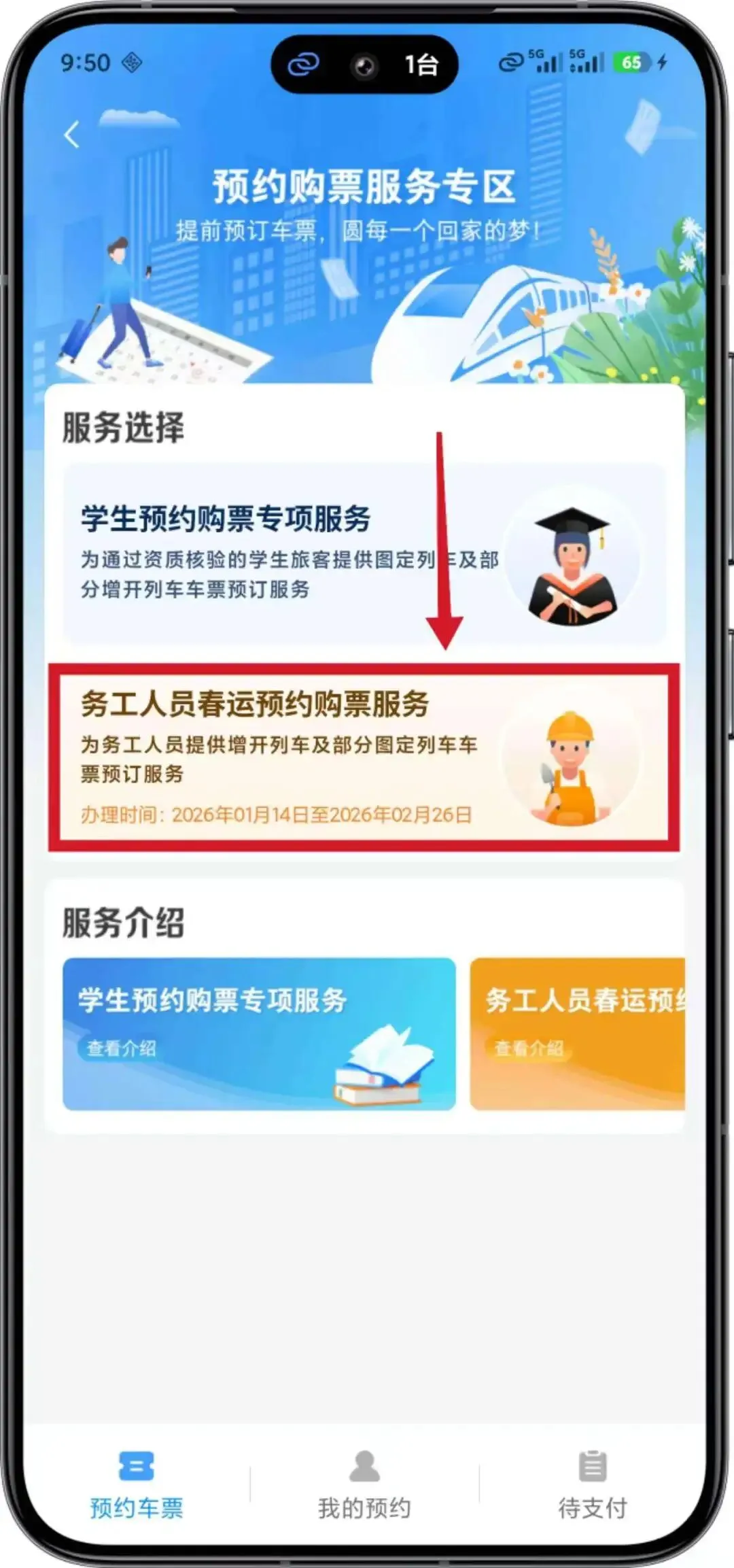 选择好出发站、到达站和乘车日期后,点击 “务工人员春运预约购票服务”。