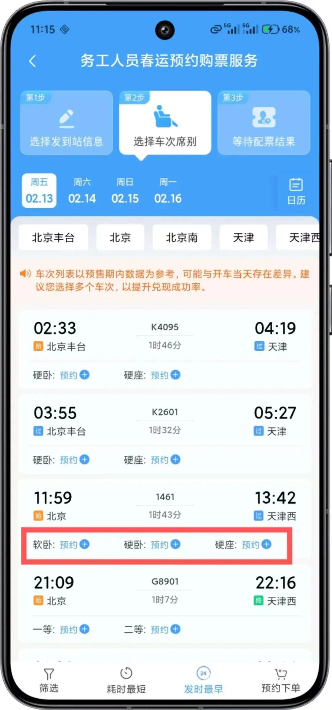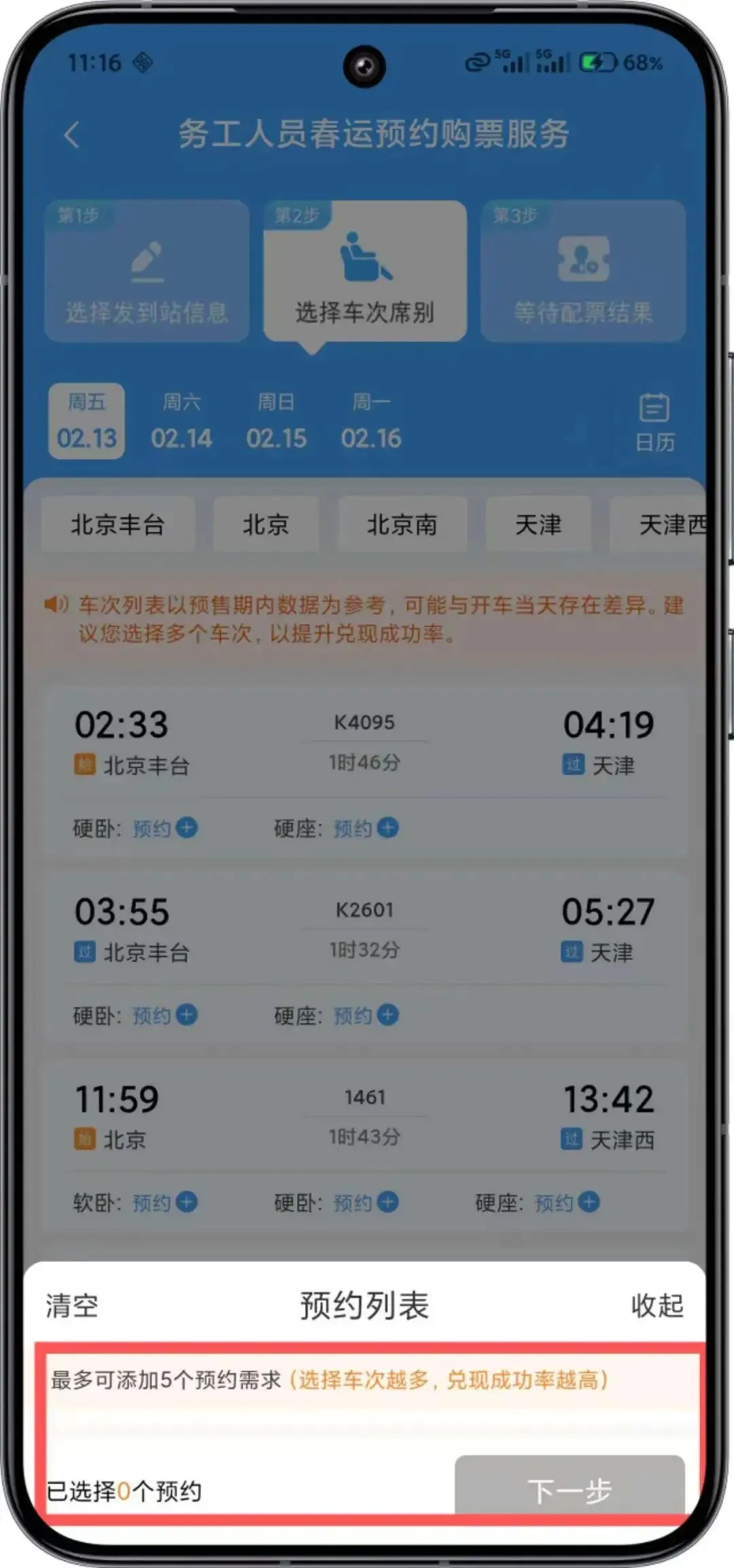 在此环节,您可以提交最多 三个 预约订单。每个订单可为 同一乘车日期 预设不超过 五个 “车次+席别”组合,即最多可覆盖 十五个 不同的备选方案。