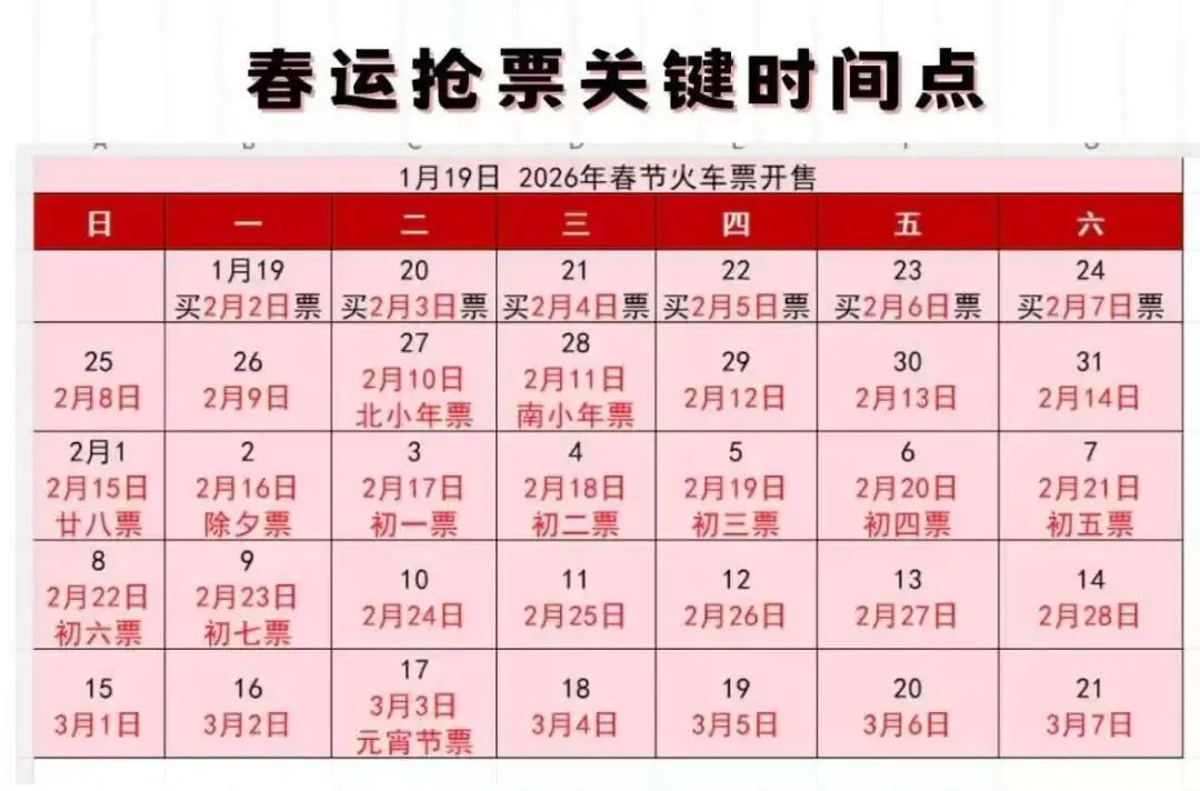 算准时间 2026年春运从 2月2日 持续到 3月13日。 务工人员预约购票:可在开车前第20天至第17天提交需求。常规购票:车票通常提前15天发售。建议使用12306APP内的 “起售时间查询” 功能,查清您所在出发站的准确放票时间。
