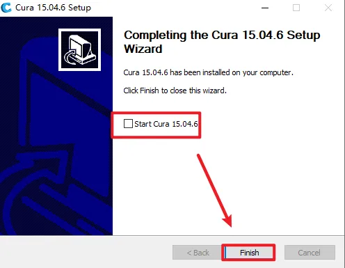 10.取消勾选“Start Cura 15.04.6”,点击“Finish”