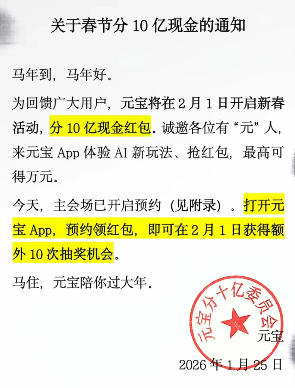 这场春节专属福利活动,将于 2 月 1 日正式开启。用户只需登录元宝 App,就能参与瓜分 10 亿现金红包。