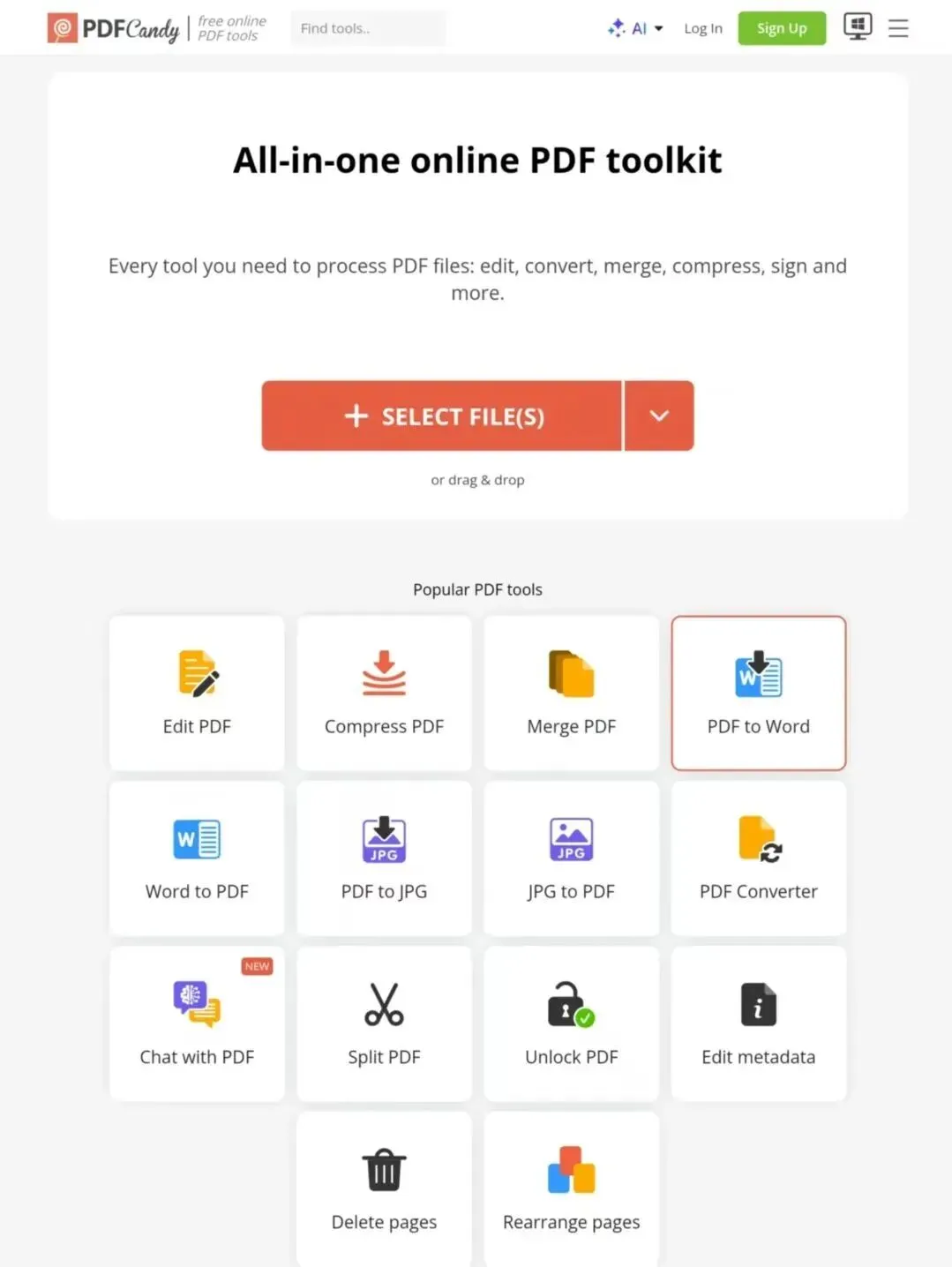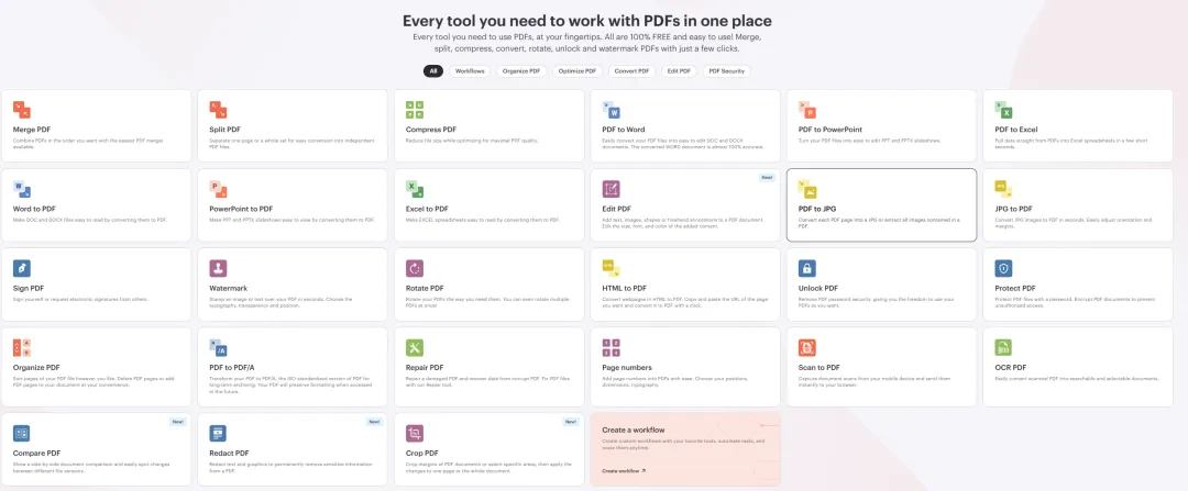 这个网站界面非常简洁清晰,目前还是免费的,各种PDF的功能都有。