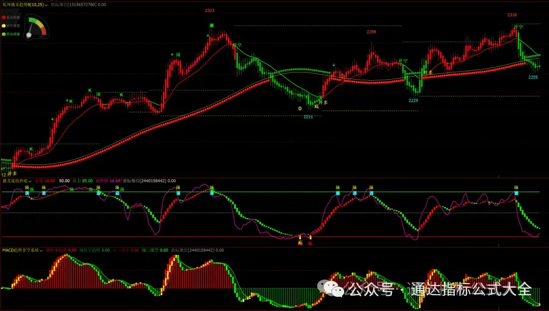 1、乾坤擒龙趋势主图+擒龙波段抄底幅图+macd趋势多空系统幅图