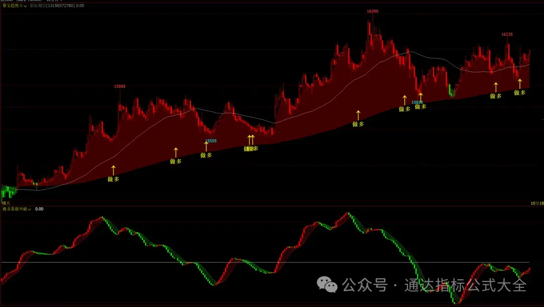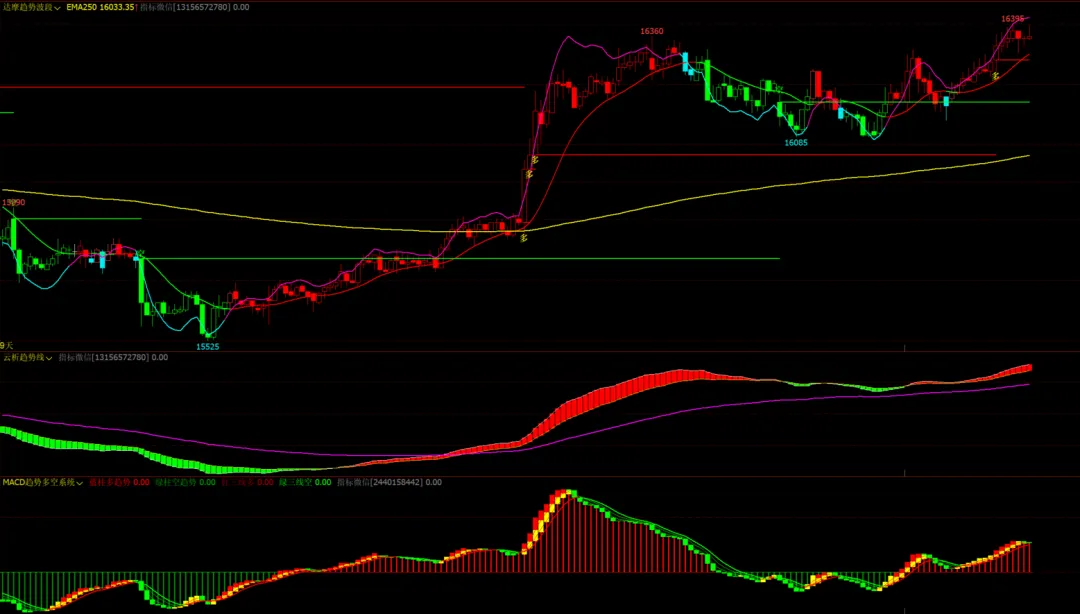 3、达摩趋势波段主图:均线,多空变色线,k线变色,多空文字画线