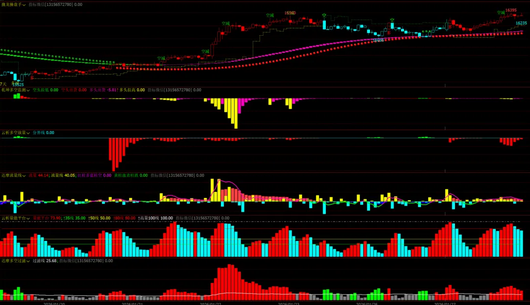 擒龙操作手主图:支撑压力画线,多空K变色,多空减仓提示,趋势判断