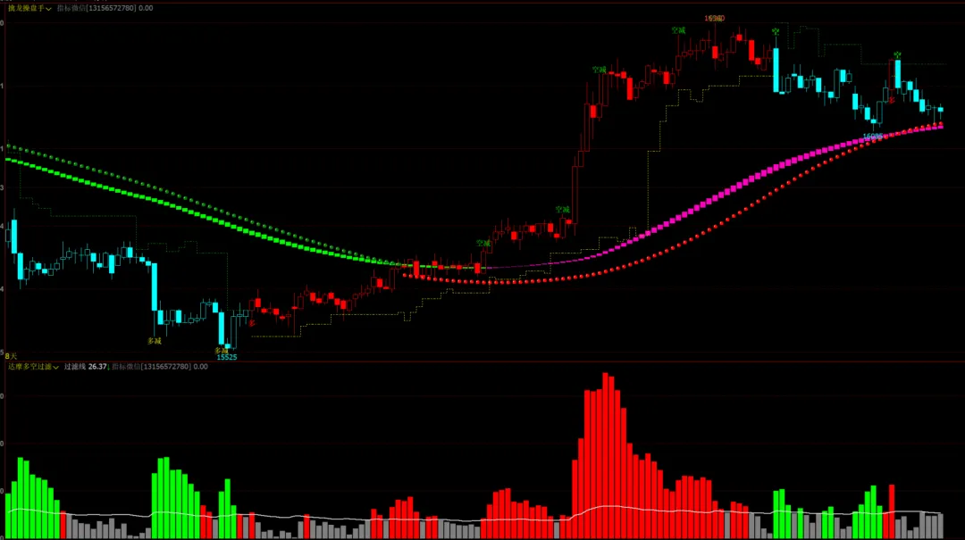 达摩多空过滤幅图:红柱多,绿柱空,灰色住震荡阶段