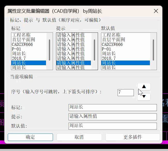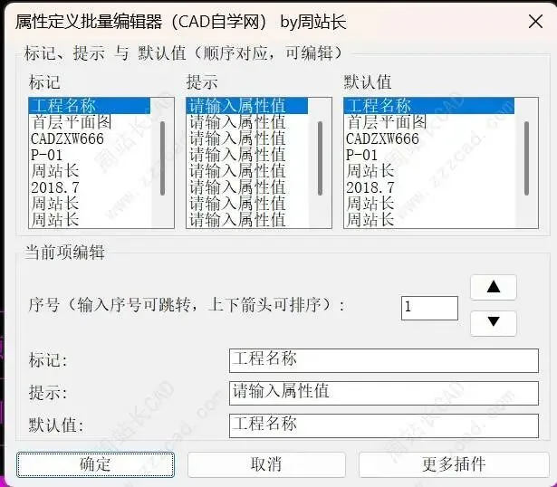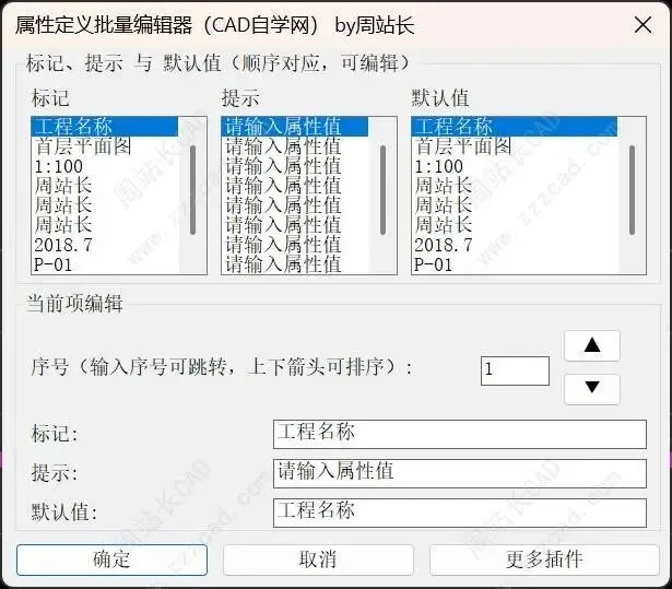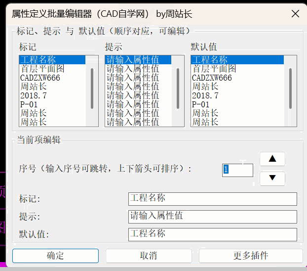 智能批量管理:提供可视化对话框,允许您在生成块之前批量编辑属性的标记、提示和默认值。更支持上下调整属性顺序,确保插入块时 Tab 键切换顺序符合逻辑。