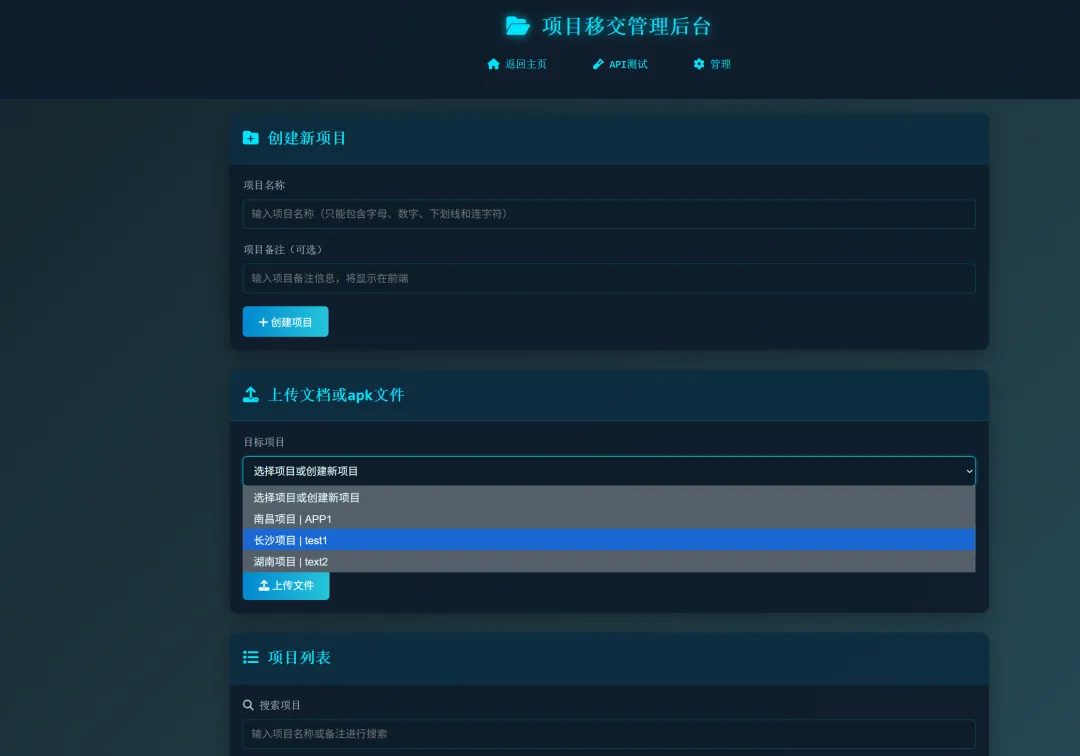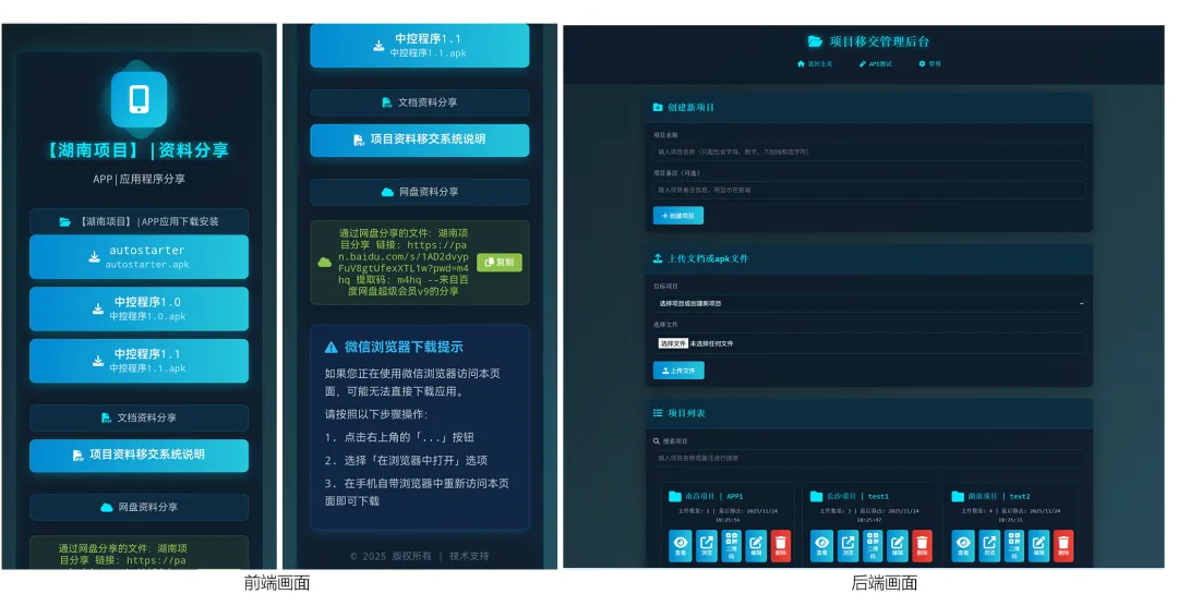 项目资料移交系统本项目是一个功能完整的项目资料移交管理系统,旨在为用户提供便捷的中控及APP下载、文档预览和项目资源分享移交服务。系统采用前后端分离的架构,前端使用原生HTML/CSS/JavaScript实现,后端基于PHP开发,无需数据库支持,通过文件系统进行数据存储。