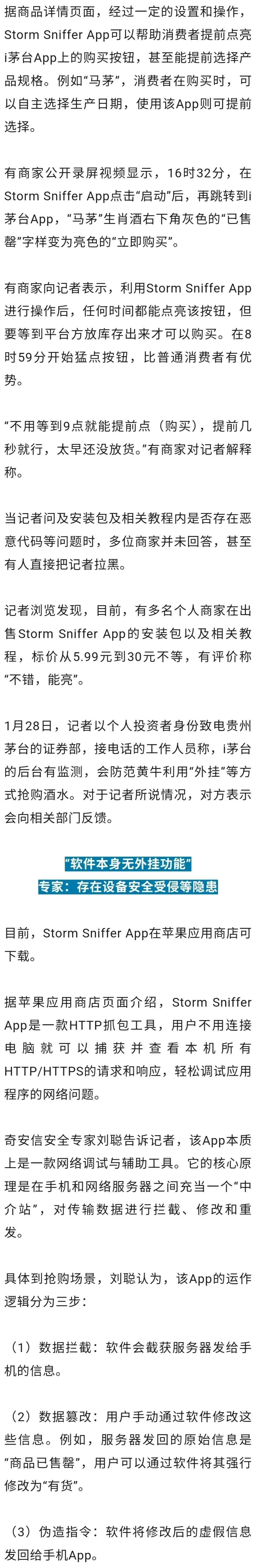 “这种软件本身不具备自动抢购的‘外挂’功能,所有数据修改和点击动作仍需由人工手动完成。”刘聪称,使用Storm Sniffer一类软件在i茅台上抢购,不仅违反i茅台内的《用户服务协议》,亦涉嫌违法。