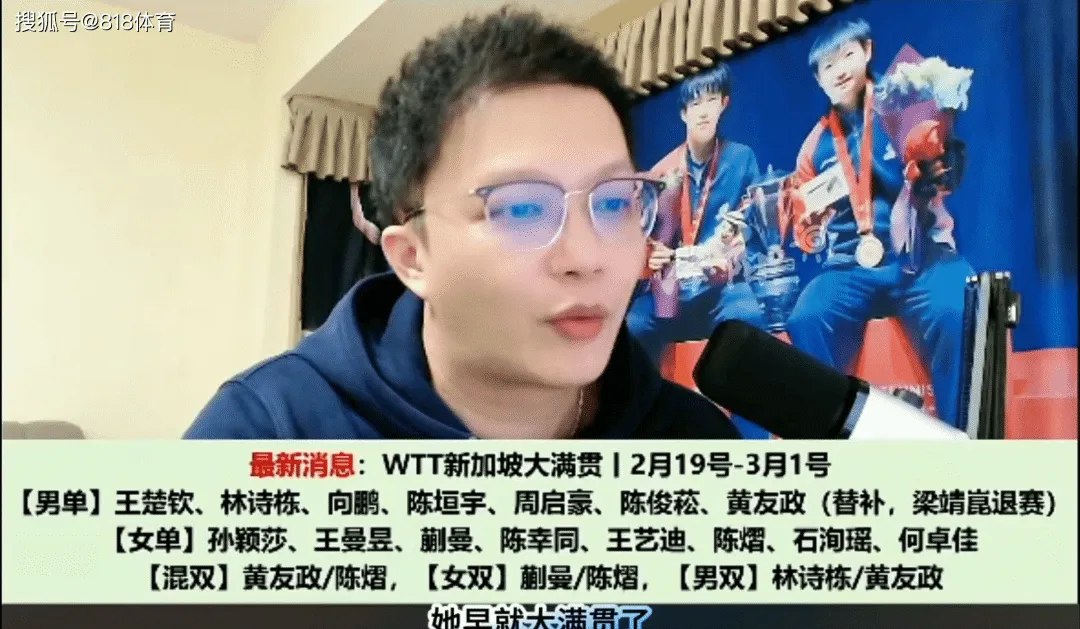 1月28日,乒乓球名嘴华少在直播中表示:“莎莎之前3年没有教练,肖指导(肖战)带曼昱应该四五年应该有了啊。其实莎莎如果她早有主管教练的话,她早就大满贯了。你看那个六大金刚里面,他们的一些履历里面都没有写孙颖莎的名字,因为他没有带过孙颖莎,但是他的成绩里面有孙颖莎的影子。