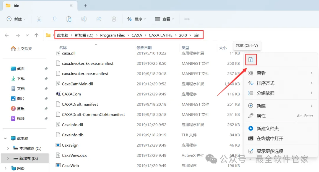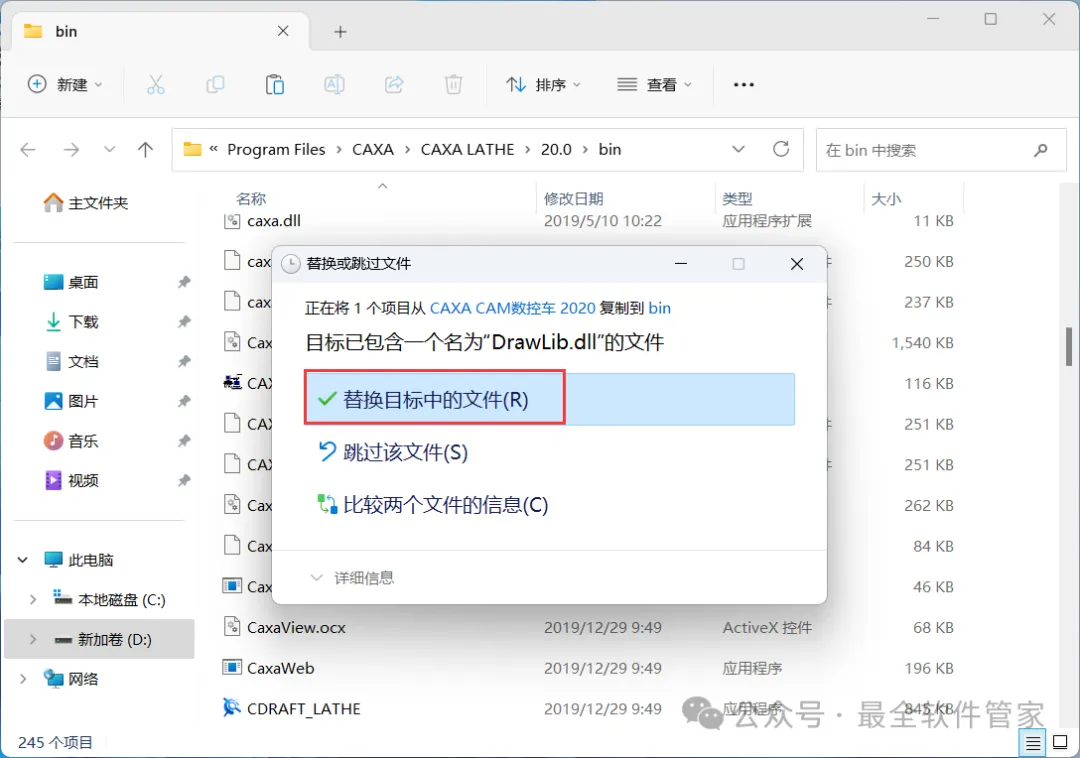9、回到CAXA CAM数控车 2020文件夹,选中【DrawLib.dll】文件,右键点击【复制按钮】