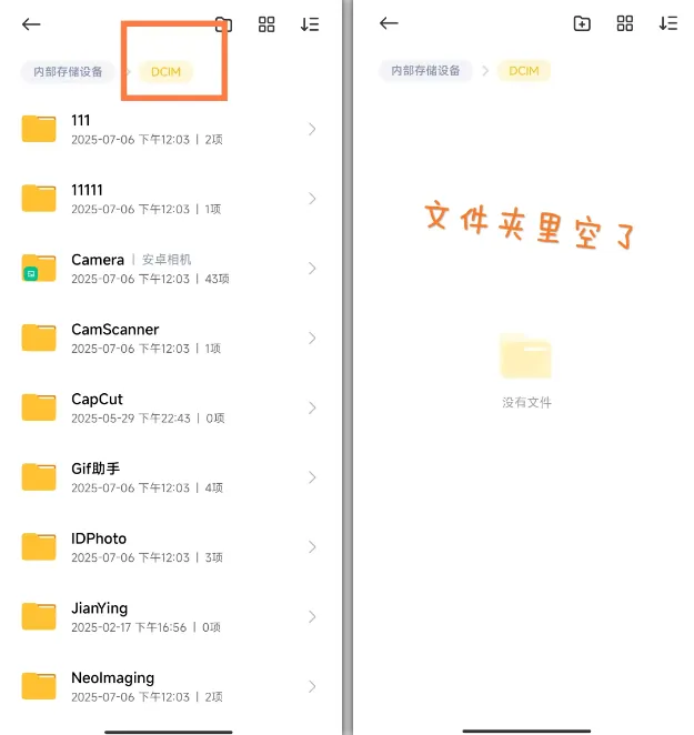 操作巨简单,选好要藏的文件夹点【隐藏】就行,比如我把DCIM文件夹藏了,普通文件管理器里就显示空的。