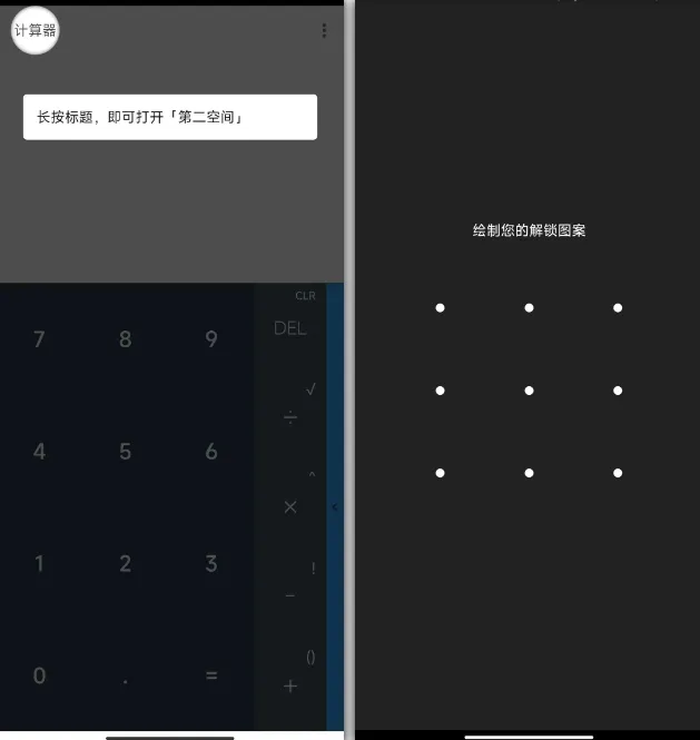 长按左上角就能进入隐秘空间,首次用设解锁图案,还能加密保防忘密码。