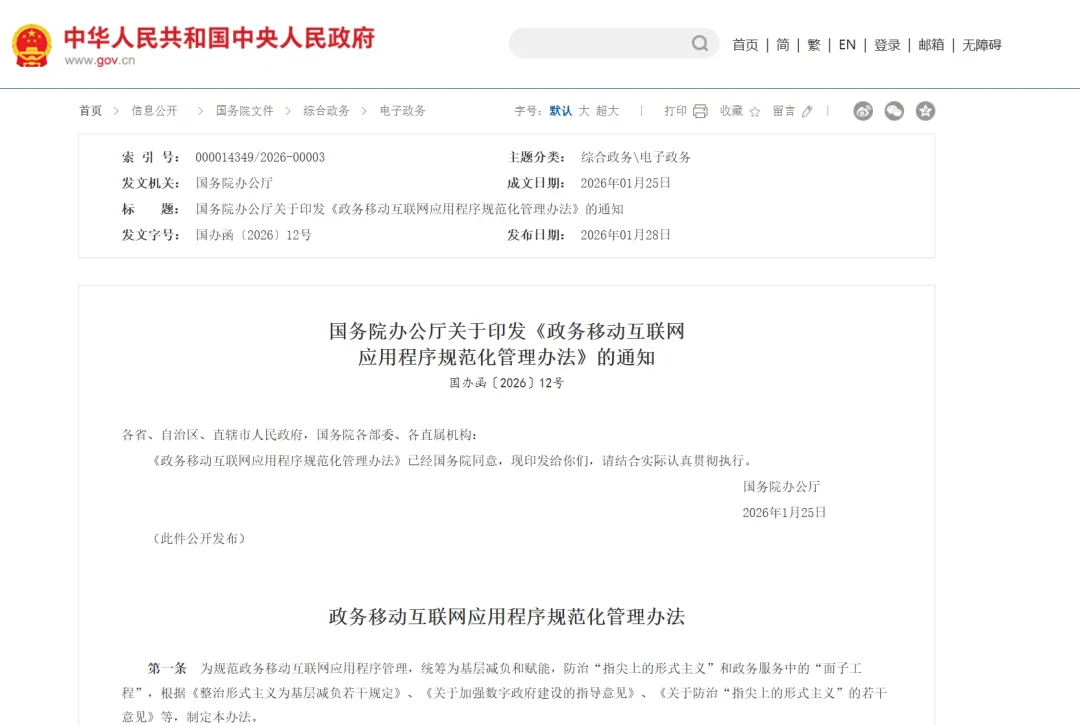 近日,国务院办公厅印发《政务移动互联网应用程序规范化管理办法》的通知。其中,主办(使用)单位应规范政务应用程序建设、使用管理,不得出现下列情况:
