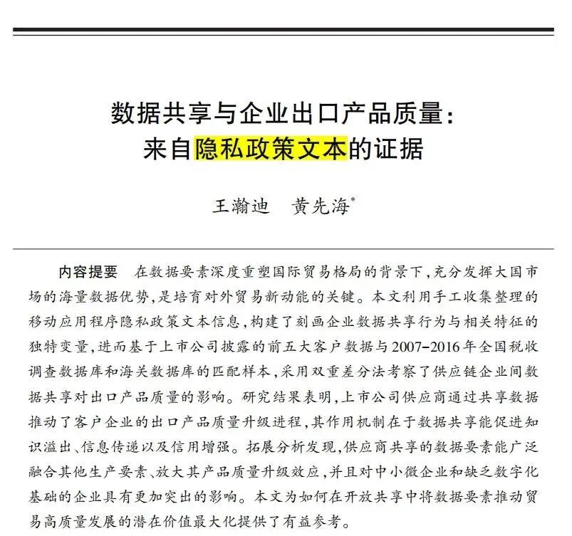 来自隐私政策文本的证据。文章的核心问题是:上游共享数据会不会促进下游企业的出口质量。