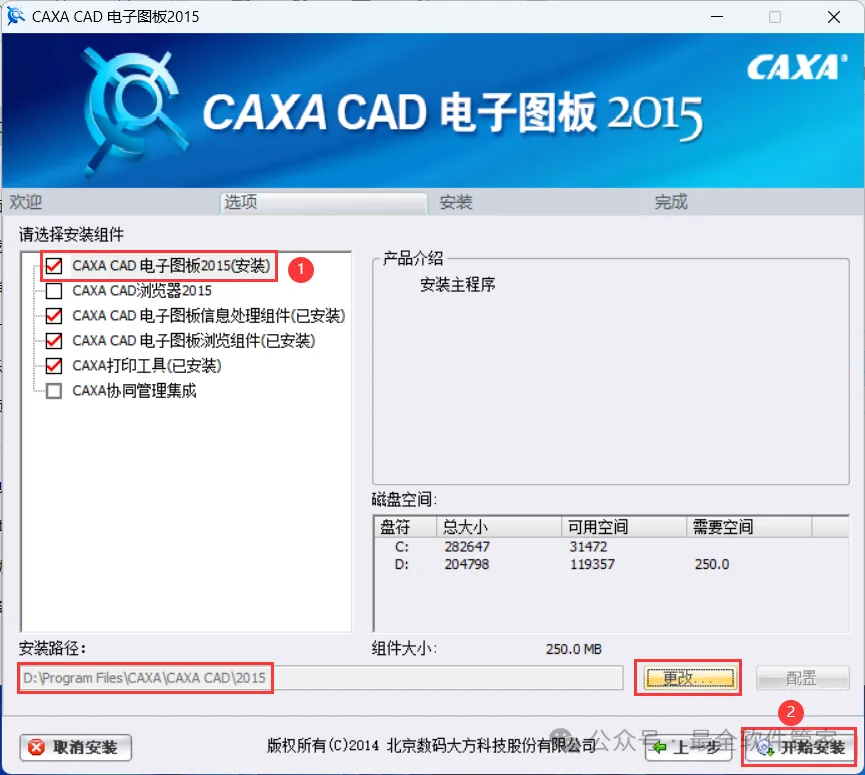 6、勾选需要安装的组件,软件默认安装在C盘,可自定义更改软件安装位置,这里小编选择安装在D盘;点击【开始安装】