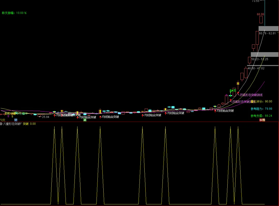 这是一个通达信技术指标公式,名为“八重形态突破主图”,集成了多种突破形态识别、风险预警、买卖点提示等功能。以下是其详细解析和使用方法: