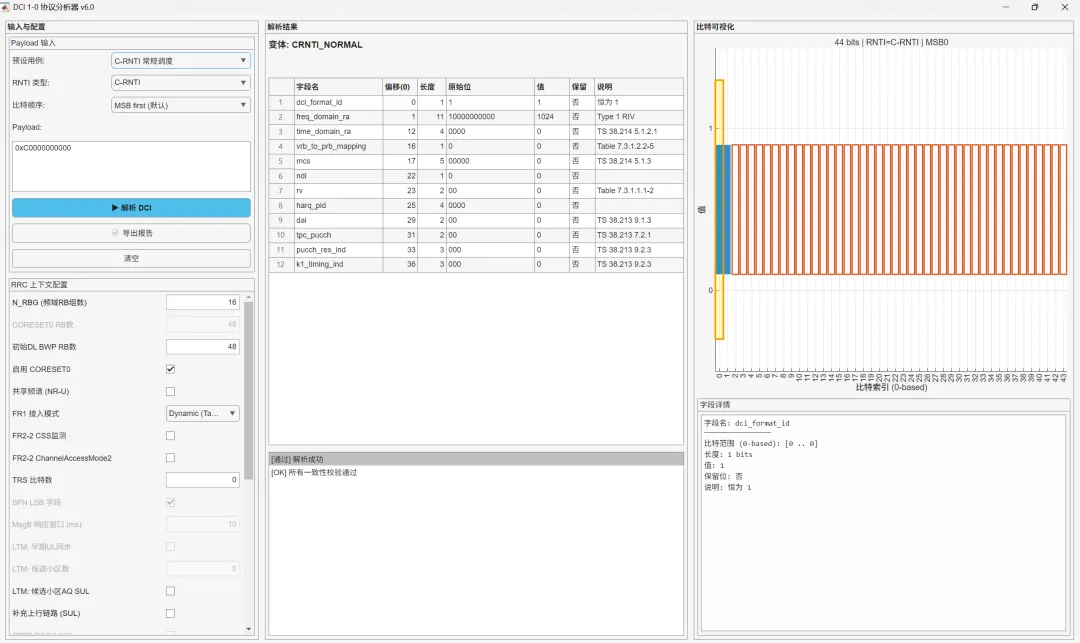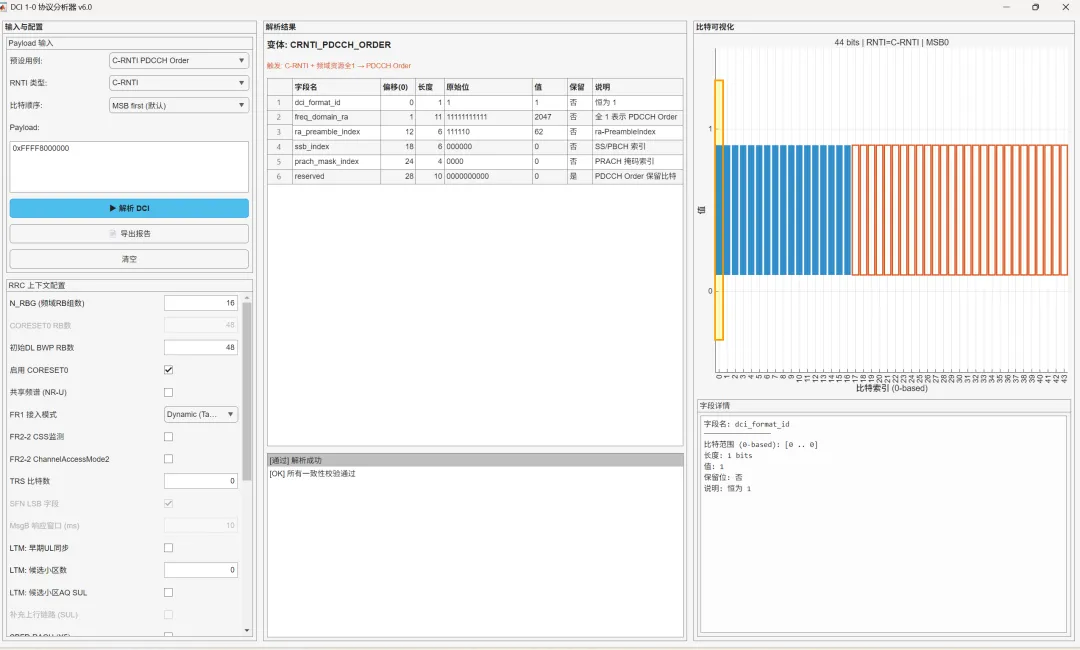 在 5G NR 系统调试中,DCI (Downlink Control Information) 的比特级解析是排查调度问题的核心痛点。面对 Format 1-0 复杂的字段复用和变体机制(如 PDCCH Order、Short Message),传统的人工对照标准协议不仅效率低下,且极易出错。本平台提供了一站式的可视化解决方案。