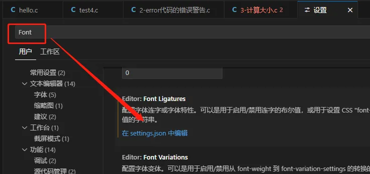 在设置中找到”editor.fontLigatures”:false这一行。 -