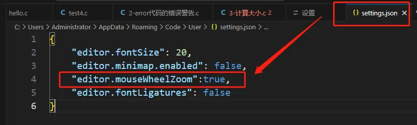 在这一行的下面添加”editor.mouseWheelZoom”:true,然后保存设置。