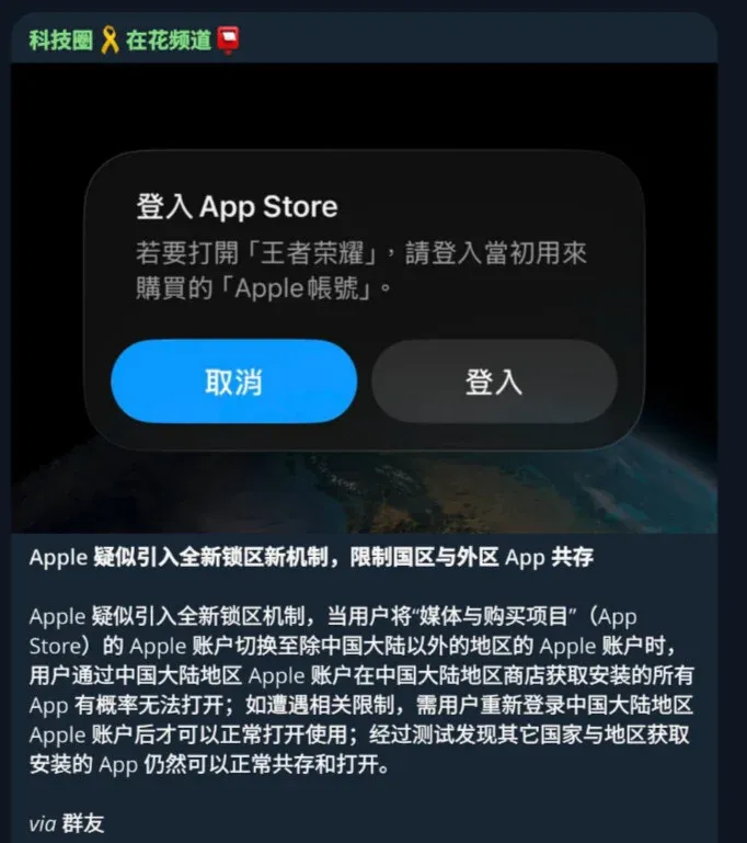 最近两天,网上疯传苹果推出全新“锁区限制”,声称国区和外区App无法共存,消息源头大多指向一个Telegram频道里的截图。截图显示,想打开《王者荣耀》App,需要登录当初购买它的Apple ID账号。